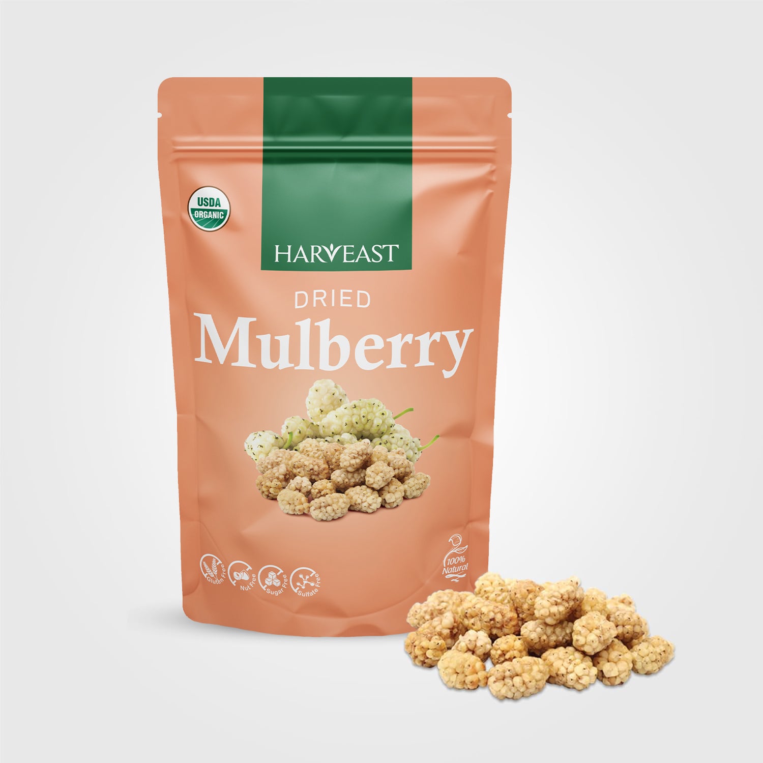 HARVEAST Turkish Dried Mulberries - Premium Gourmet Dehydrated Fruits - No Sugar, Gluten Free, Kosher, Vegan, Non-GMO - Dry Mulberries in Resealable Pack - Delicious Healthy Snack